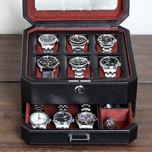 スライド式のドロワーは、追加の腕時計やストラップを収納できるだけでなく、カフスボタン、指輪、ネクタイピン、サングラス、ペン、紙幣、カード、時計用ツールなどを収納するスペースとしても使えます。ご注意:赤い内装は、白や淡い色のストラップとの組み合わせはお勧めしません。長期間保管すると赤い色が移る場合があります。